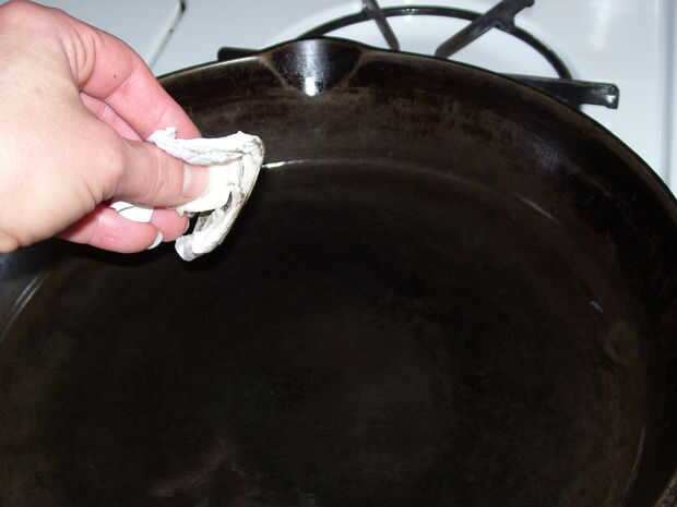 3) hacer esto hasta que todo el metal es brillante. Si lo viertes en la bandeja que funciona, también, pero poniendo demasiado en hace que la superficie de la cacerola pegajosa, en vez de antiadherente.