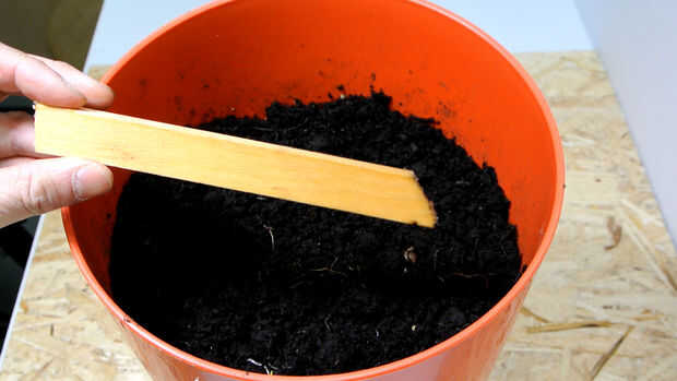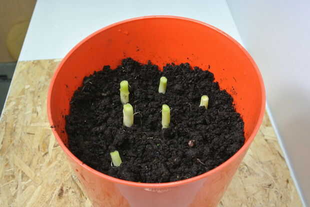 Con el palito poke algunos agujeros en el suelo y coloque las cebollas verdes en el suelo. Pueden sembrarse muy juntas, manteniéndolas separación alrededor de 2 pulgadas una de otra.