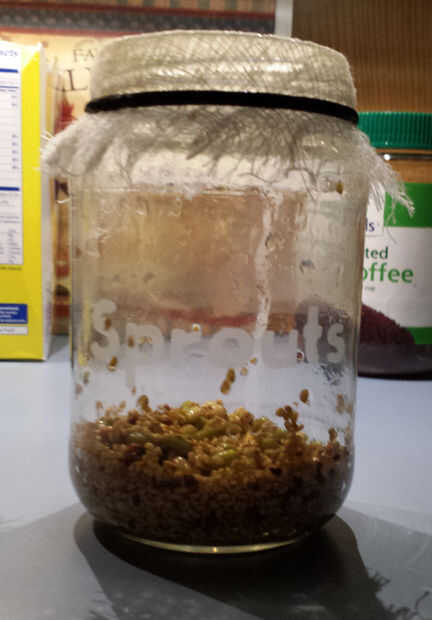 Drenar toda el agua de la jarra a través de la estopilla girando el frasco boca abajo. Le dan unos batidos si las semillas están obstruyendo los orificios de la estopilla.