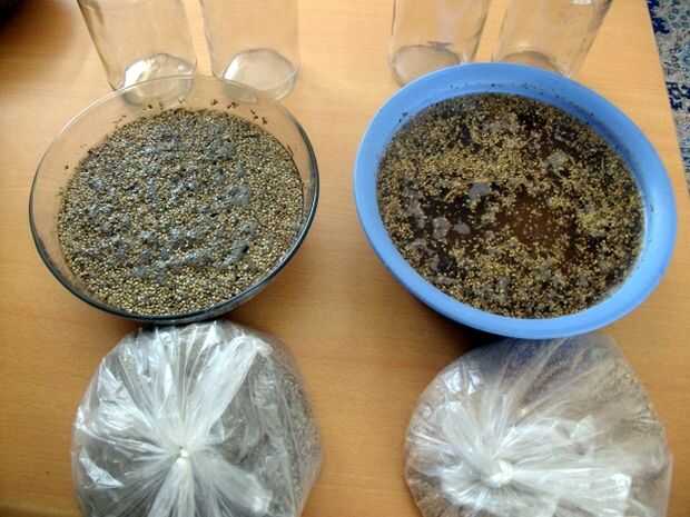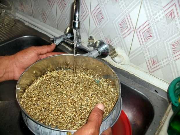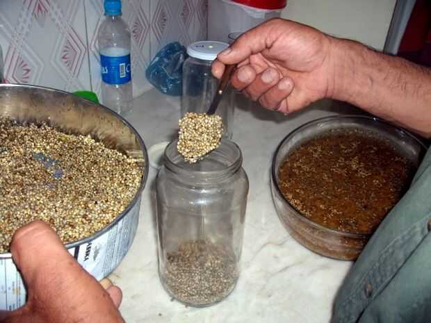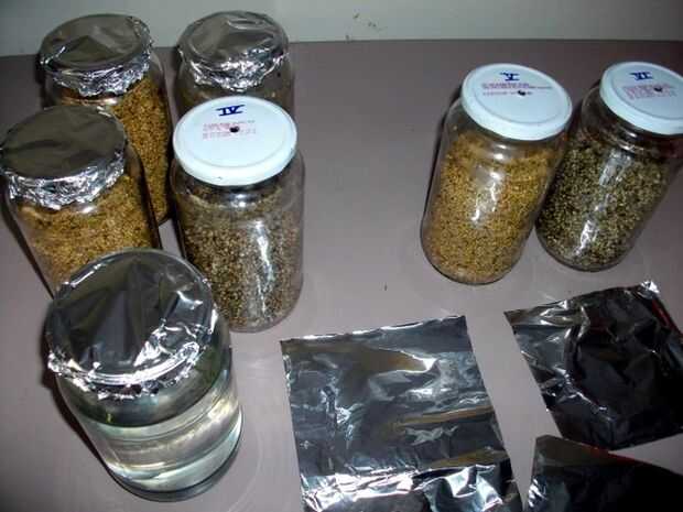 Mida aproximadamente 2/3 tarro de grano por jar necesario (el grano se expandirá un poco como se empapa). Remojar el grano durante 24 horas en un recipiente con agua (usar agua suficiente para cubrir completamente el grano. Si usted está usando más granos, como trigo o maíz, encontré simmering el grano durante 30 minutos en lugar de empapar ayudó a prevenir el crecimiento de moldes no deseados. Enjuague y drene completamente el grano. Los frascos de litro deben ser 3/4 llenado de grano y las tapas (con agujero de respiración) instalado y tapado con papel de aluminio.