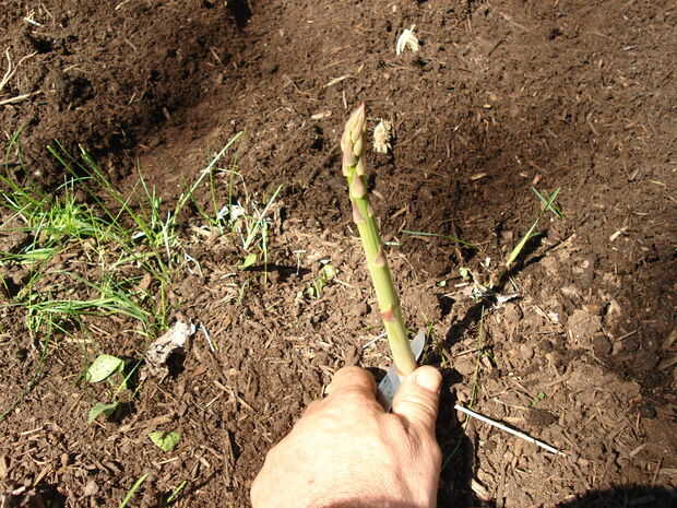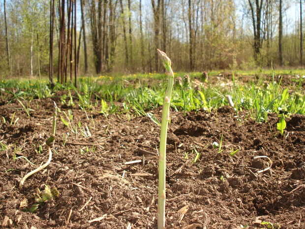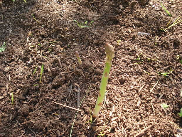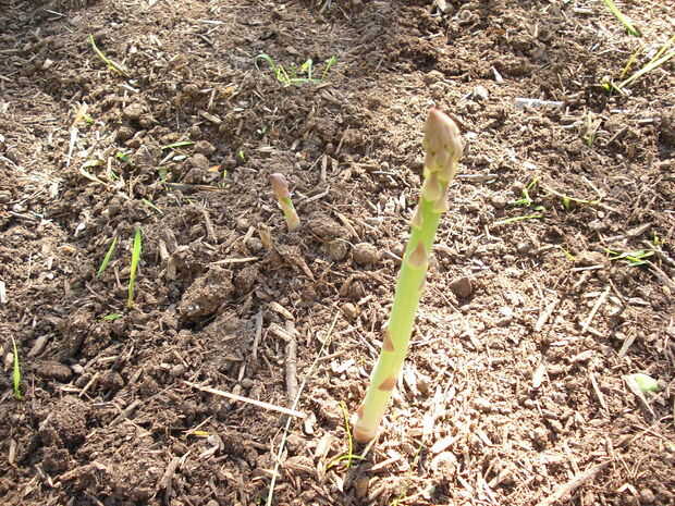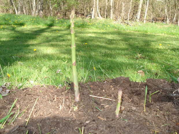 Espárragos que el principio de puede y debe dejar de ser cosechadas al final de let June.After junio los tallos crecen y van a las semillas. Se desarrollan pequeños frutos rojos y la parte superior del tallo. Estos se caen y crear nuevas plántulas.