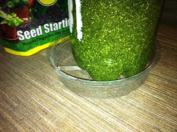 1. configurar el contenedor de 2 litros ya que las semillas plantadas en un recipiente que será recoger el agua extra que se filtra a través de.