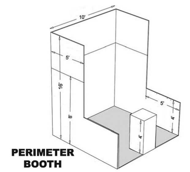 Un stand de demostración perímetro comercio respalda a una pared del lugar de exposición en lugar de otra exposición. Este espacio le da la opción de altura extendida sobre la pared posterior y paredes laterales de la cabina. También suele venir con un precio premium.