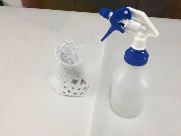 Me encanta el look de huellas de polvo, pero por supuesto son tan frágiles. Curado, o el polvo con otras soluciones de la "infiltración" hace la impresión más fuerte. Puede utilizar pegamento como el Zap-A-Gap o Starbond o incluso epoxi para infiltrarse y así curar impresiones de polvo de Z Corp, pero estos cambian la apariencia del material. Si usted quiere mantener la apariencia mate, polvo de la original grabado, prefiero usar agua salada para curarlos.