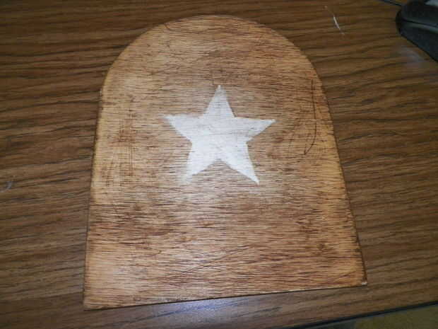 Con su sierra caladora, corte un semicírculo en un extremo de la pieza de madera (alrededor todo lo posible). Luego, utilizar el papel de lija para redondear los bordes afilados. Lijar muy bien con el grano en la preparación para la tinción. Durante el proceso de lijar, raspar la madera lijando a contrapelo, es cómo dar el look rústico.  El cuerpo básico debe asemejarse a la de la foto de arriba (excepto el diseño y la mancha).