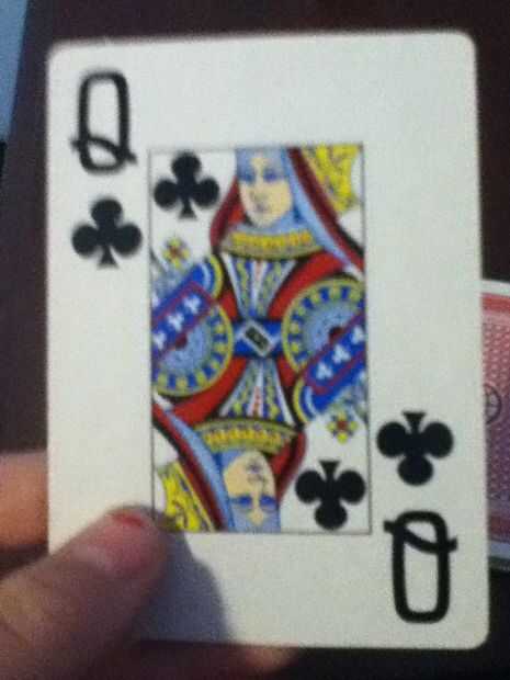 Dicen que escogieron una reina de los clubes. (No olvide Dile que no le permiten verla) después que han memorizado la tarjeta, separar la baraja en tres montones. Les pedimos poner la tarjeta en la parte superior de las pilas.