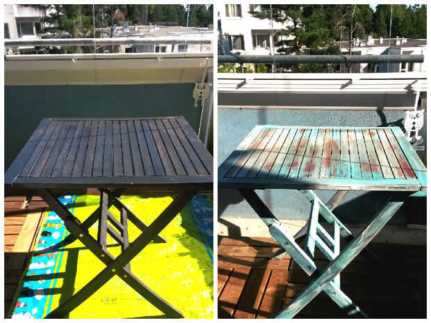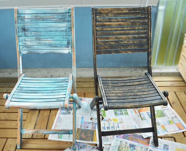 Una vez que han lijado las sillas se puede aplicar la pintura. Para este proyecto usé teal color pintura de madera, blanco, oro y metal las pinturas de acrílico. Primero apliqué la pintura turquesa y una vez que seca he añadido las otras pinturas.