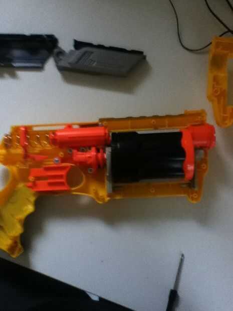 este mod permite que el cañón de su maverick nerf a salir más.Paso 1: desmontaje Tomar los tornillos en la diapositiva la primera. luego tire de ella. Luego sacar todos los tornillos y tire su Maverick aparte. Debería ver esto.Paso 2: Eliminación de