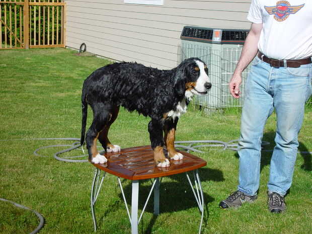 En primer lugar, usted necesitará encontrar un lugar adecuado para lavar tu perro. Quiere evitar un lugar que te arruinado con mucha agua o barro. Sugiero una ubicación exterior, si utiliza la bañera, se preparan para limpiar un baño mojado, peludo. Conseguir su perro en un objeto limpio, elevado, como una mesa o taburete, de fácil acceso. Esto puede ser necesario cierto entrenamiento. Si su perro no puede permanecer sobre la mesa, colocar una correa corta a un poste junto a la base, lo suficientemente corto para evitar que el perro saltando.