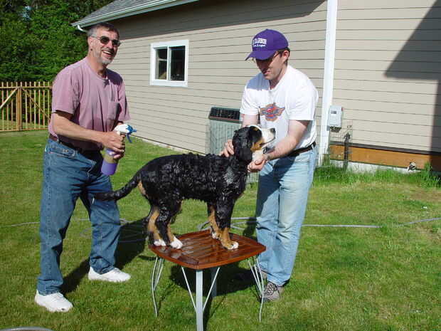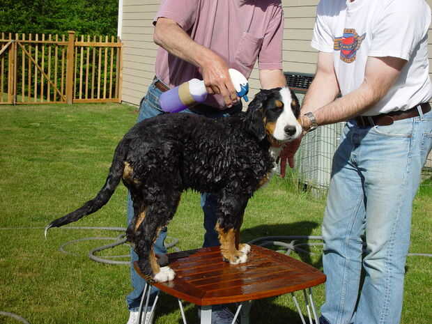 Diluir el champú con agua y colocar en una botella de spray. Se aplican fuertemente a cada pulgada del cuerpo de su perro, incluyendo las patas y la cola. Frotar el champú profundamente en la capa y si es posible, llegar a la piel. Tenga mucho cuidado alrededor de los ojos, oídos y nariz. No quiero causar irritación y malestar. cuando cada pulgada de su perro es enjabonado, lávela con agua de la manguera. A diferencia de los seres humanos, no repitas. Mojado, espuma, Washington