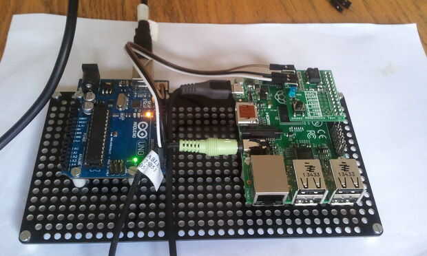 Hay una junta especial interfaz (o protector) que se conecta a la Pi de frambuesa que se adapta la señal de 5V de la salida de TTL de Arduino a la entrada 3c3 requerida por el Raspberry Pi. Todo lo que se requiere es conectar tres cables (Rx, Tx y GND) entre Arduino y la frambuesa y estás en el negocio.