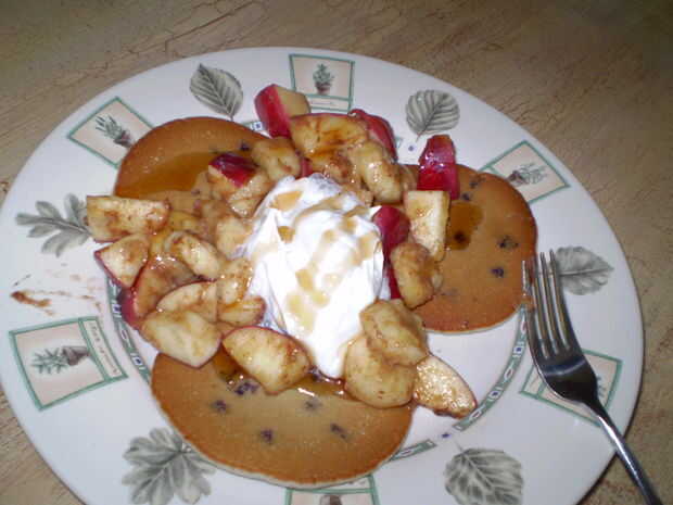 Terminar la cocción, luego haga las tortitas en el microondas y cocinar durante 1 minuto. Sacar las manzanas cocidas y plátanos a sus panqueques y añadir coolwhip y un poco de jarabe de arce. Disfrutar. Comenten y puntuen!