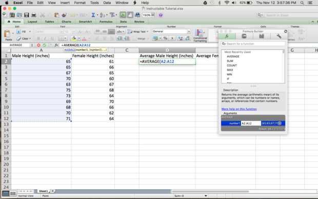 A continuación, se destacan los datos que está por debajo de la columna titulada, "Hombre altura (pulgadas)". Poniendo de relieve estos datos, están dejando Excel sabe que se trata de los datos que desea utilizar para producir un cierto resultado en la columna de altura masculina media. Se mostrará la barra de la ecuación "= A2:A12". Esto representa que las celdas de la A2, a través de la A12 son las células con los datos que se utiliza en esta ecuación particular. Estos números se diferencian dependiendo de cuántas células se utilizar en cada columna para entrada de datos y lo que las células te quieren utilizar para generar el promedio.