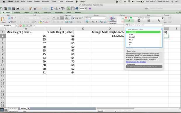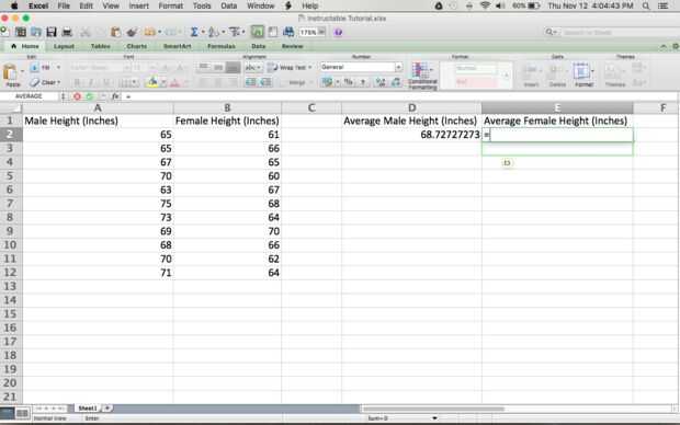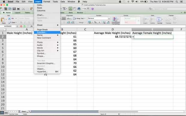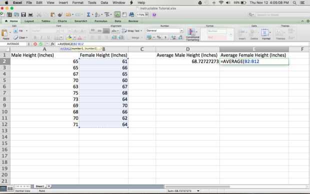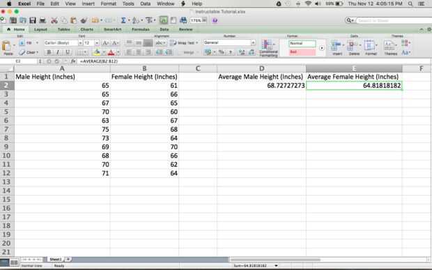 Repita los pasos 5 a 10, pero lo hace desde la posición de las alturas. Inicialmente, en lugar de seleccionar la celda en blanco debajo de "Hombre de media altura (pulgadas)", introduzca el signo igual debajo del título "Mujer de media altura (pulgadas)" en la primera celda vacía. Luego, repita el proceso de selección la media de la ficha Insertar y luego la opción de función y luego seleccione los datos que está debajo del título "Mujer altura (pulgadas)", así que las células B2:B12. Luego, pulse el enter o botón return en su teclado y la altura media para los miembros femeninos de la clase aparecerá debajo de la columna "Altura femenino media (pulgadas)". El promedio que aparece aquí es 64.81818182 pulgadas, que significa que la estatura promedio femenina 64,82 pulgadas o cinco pies y cuatro pulgadas.