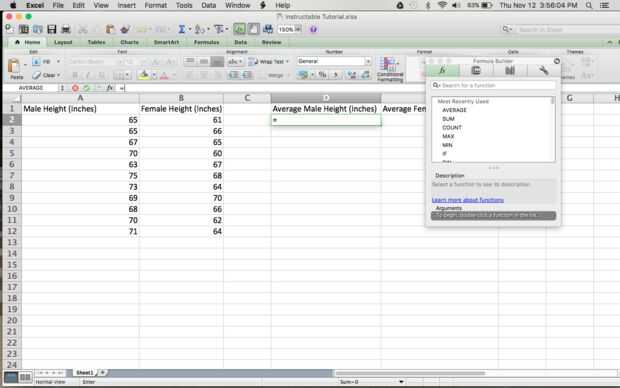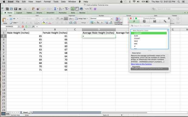 Cuando se selecciona la opción de "Insertar"--> "Función", aparecerá un cuadro pequeño en la hoja de cálculo. Este cuadro contiene todas las ecuaciones pre hechos que puede elegir entre seleccionar y entrada en la barra de la ecuación los datos calculados automáticamente. Se ofrecen una variedad de ecuaciones de la media, suma, máximo, mínimo y así sucesivamente. Con el propósito de este tutorial, seleccione la opción que dice "Media". Una vez que usted seleccione promedio, será registrado automáticamente en la barra de la ecuación en la parte superior de la hoja de cálculo como este: