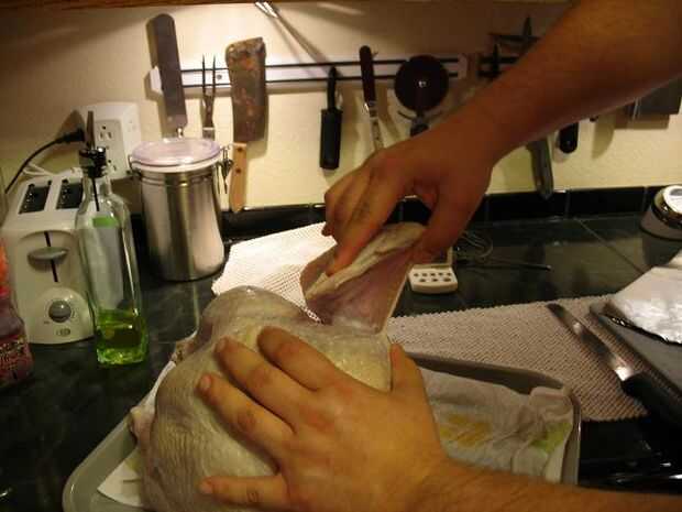 Ahora Levante el ala y Remétala bajo (ver fotos). Esto ayuda al gobbler sentarse en el asador.
