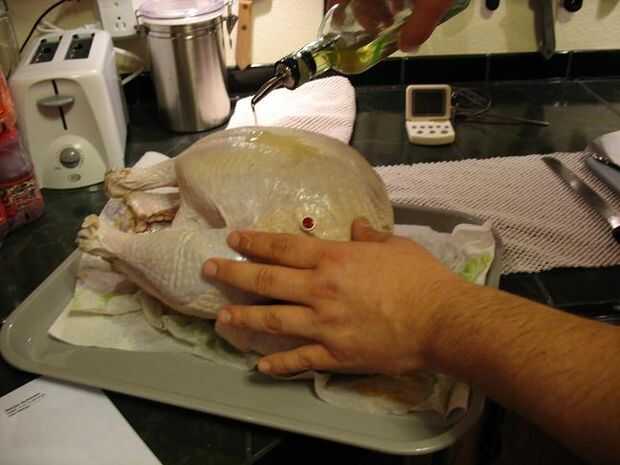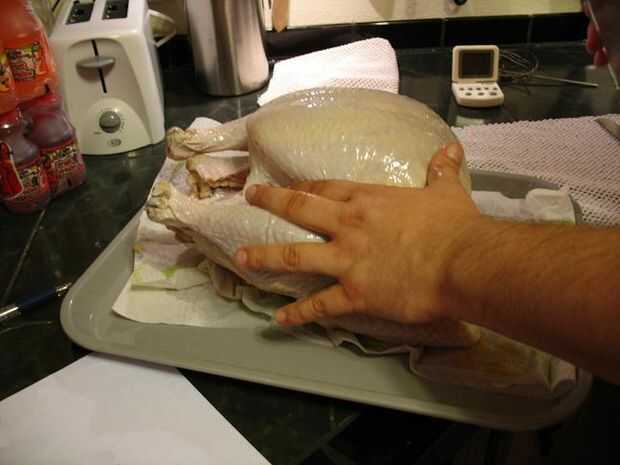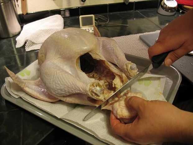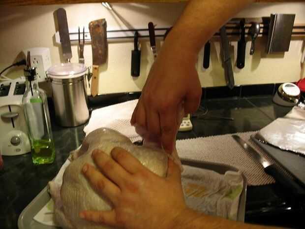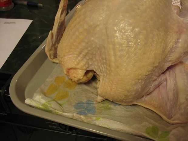 Coloque el ave en una superficie antideslizante (en el asador está ok, pero pasar a tener una bandeja de plástico y toallas de papel en lugar de otro). Recorte la grasa de cuello y cola. Estos pueden ir en caldo de pavo, pero quemarán si no recortan ahora.