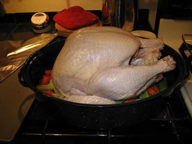 Romper o aproximadamente trocear las verduras viejas (apio, zanahoria, cebolla) y cubrir el fondo de la cacerola de la asación. Esto mantiene el pavo desde el fondo de la cacerola. Si tienes un rack que se ajusta a la parrilla, usted puede utilizar en lugar de otro.