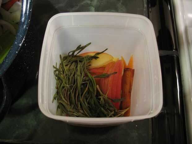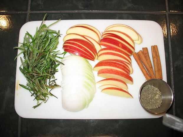 Para los compuestos aromáticos... combinar manzana, cebolla, canela, Romero y salvia en un recipiente de microondas seguro. Añadir un poco de agua y nuke durante 5 minutos en alto mientras haces los siguientes pasos.