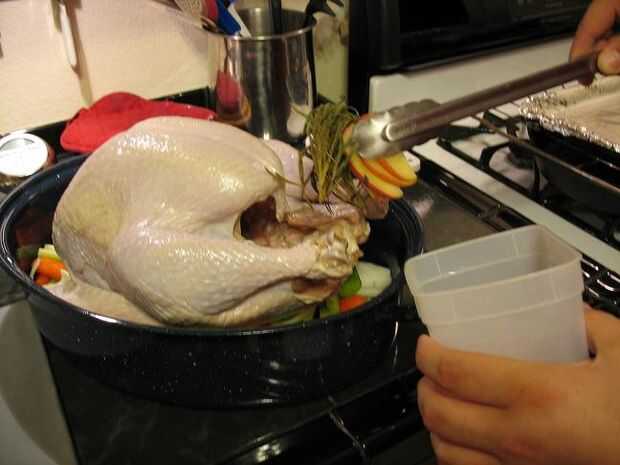 Añadir un poco de agua a la olla (este paso será evitar que el aceite de la quema durante la fase de 500F y no vapor el pájaro en todos).