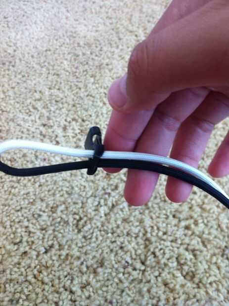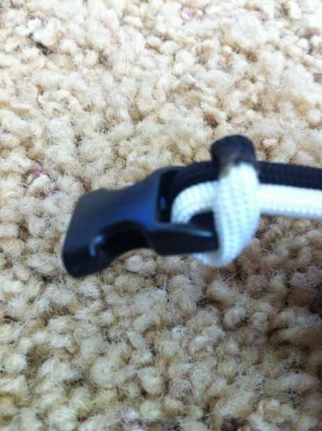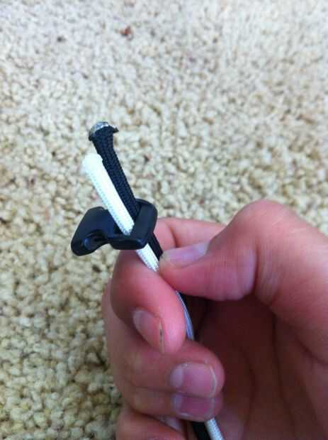 Ahora hacer exactamente lo que yo hago en las fotos porque yo no se se explica todo. En primer lugar, tome el extremo de su paracord y ponerlo debajo del clip no más. A continuación tire de ella a través de más lejos. Ahora la curva sobre el clip. Tire del lazo para terminar que no.