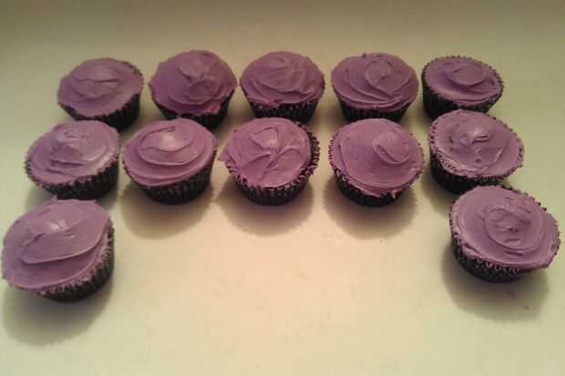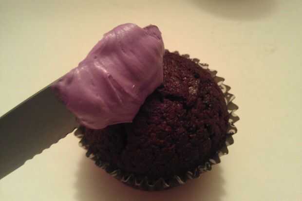 Lo primero que debe hacer es difundir la guinda base (en este caso el glaseado morado) en la parte superior de cada cupcake tan suavemente como sea posible. Usted necesitará una capa lisa en orden para las decoraciones mirar su mejor. Repita para los cupcakes.