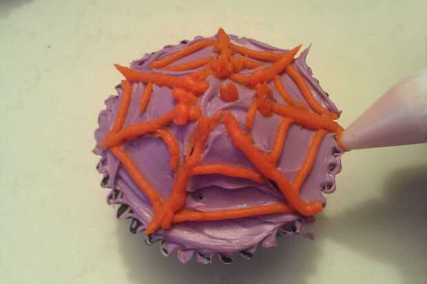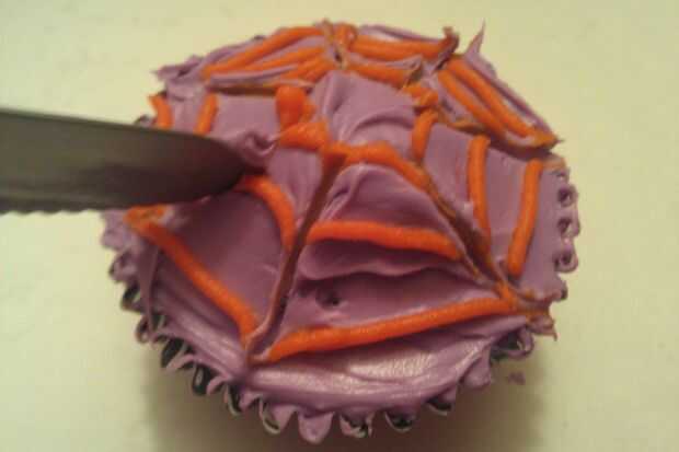 Para hacer la araña web decoración, utilice la punta de escritura (línea fina) para hacer tres círculos concéntricos y un punto central sobre la thr de la Magdalena. Luego, tomar un cuchillo de mantequilla y arrastre la guinda en ángulos uniformes para hacer un diseño web. Por último, la tubería más glaseado para cubrir las líneas de arrastre.