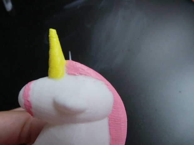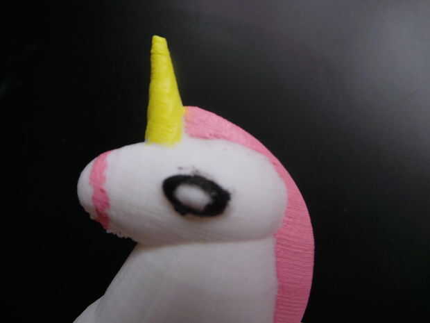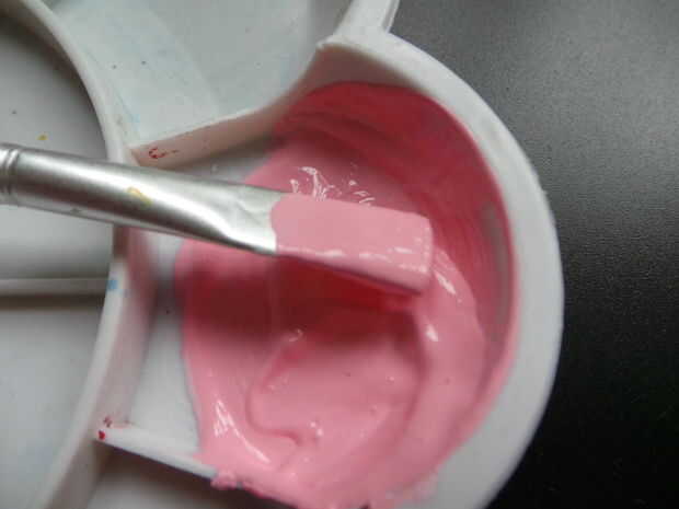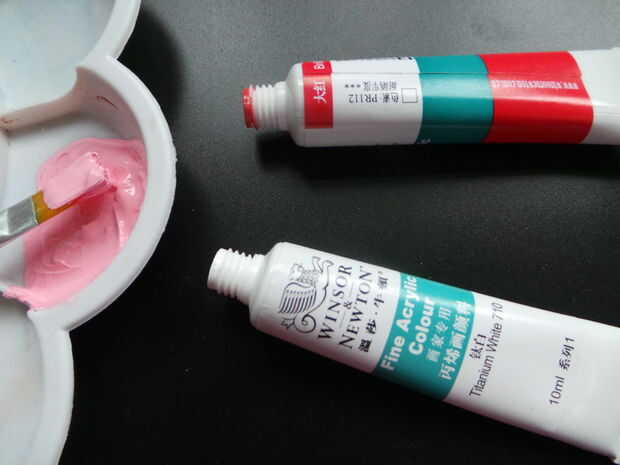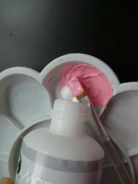 Primero, uso rojo y blanco para crear el color rosa, añadir algún medio color de acrílico y luego mezclar bien. Los pies, boca y acicula rosa, ojos de pintura negra, pintura del cuerno amarillo. Dibujar un símbolo en la parte posterior, dibujo un corazón.