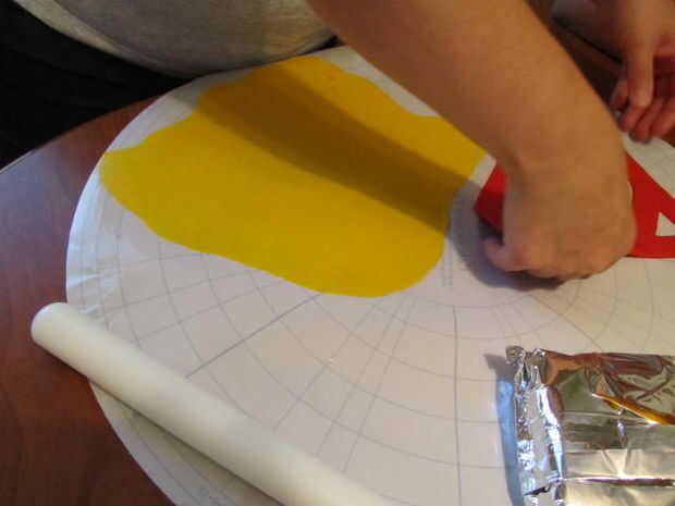 Ahora sólo tiene que colocar el rojo cortado insignia en el fondant amarillo. Cortar el logo en el fondant amarillo.