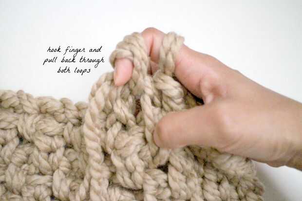 Esta parte se centra en el medio de un medio ganchillo doble, cuando tienes dos lazos en el gancho o el dedo. Hilo sobre como usted generalmente, entonces forma el dedo como un gancho real para permitir que los otros dos lazos deslizar para que sólo se quedan con un lazo en el dedo.