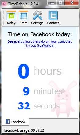 Escribir en un bloc de notas o utilizar una aplicación como TimeRabbit (disponible en http://www.gigawatch.com/TimeRabbit) para las horas perdidas por el agujero de conejo de Facebook en una semana. Registrar el tiempo de sesión y cierre la sesión, luego total el tiempo de desplazamiento a través de su servicio de noticias de esa semana.
