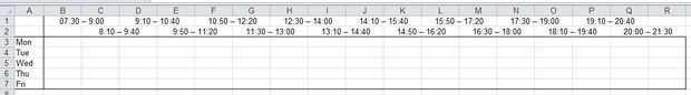 - Los alumnos tienen horarios del lunes al jueves y por lo general 5 o 6 temas. Tiempo total para un solo tema es 2 x 1,5 o 3 x 1,5 horas. Tiempo total empleado en la escuela es de 15 a 18 horas por semana. Horario libre se parece a esto: (imagen adjunta). (También hay un vacío archivo Excel adjunto).