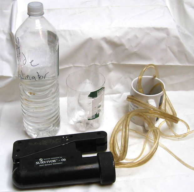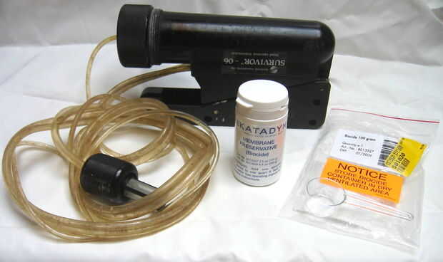 Luego no sabía qué hacer con la izquierda sobre la mezcla de biocidas, por lo que vierte en una botella de agua con la etiqueta "biocida para desalinizador"