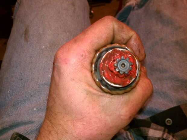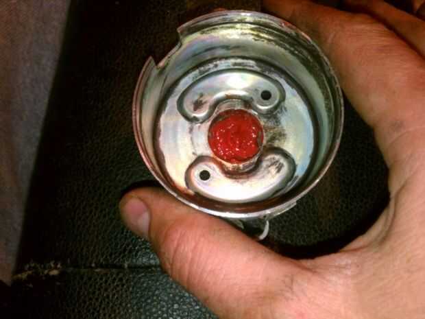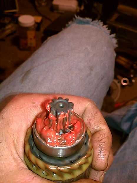 Engrase de rodamientos viejos es un proceso multi-step. Me gusta inyectar cada espacio entre las bolas, luego ruede a mano para trabajar la grasa en la carrera. Entonces, voy a añadir más grasa alrededor de la parte superior de la carrera. (Ver fotos). Su grasa roja obtendrá más oscuro como se mezcla con la grasa común, que podría haber sido negro, o podría haber sólo conseguido sucio con el tiempo. Este motor de arranque parece original y tiene la misma cantidad de grasa que el resto del motor (piense, anillos de los árboles para la datación de la edad) que podría hacer treinta años!