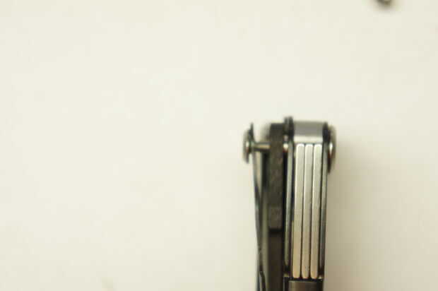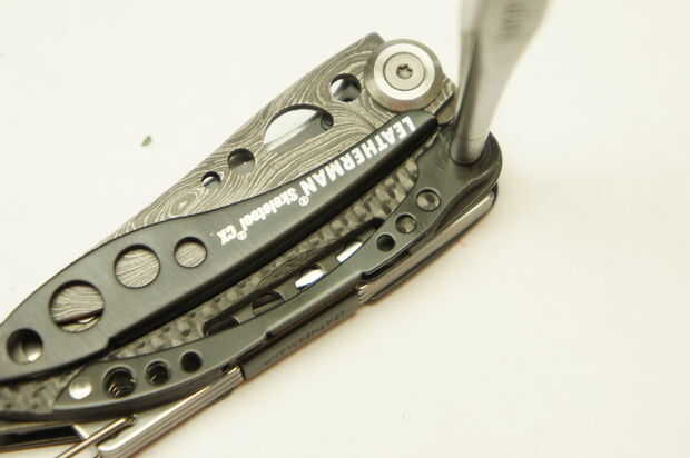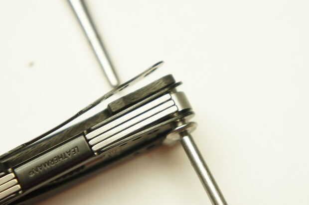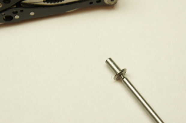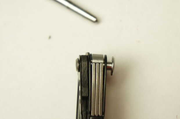Si eres incapaz de obtener el pin a través de todas las capas de la herramienta, usted puede tratar usando el tornillo del lado clip para ayudar a tirar el perno a través del resto de la manera. Tenga cuidado con este método, ya que es fácil pelar hacia fuera el tornillo o el perno. Las fotografías demuestran este método.
