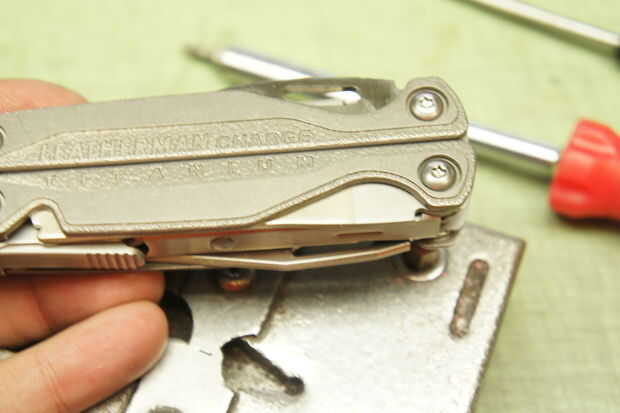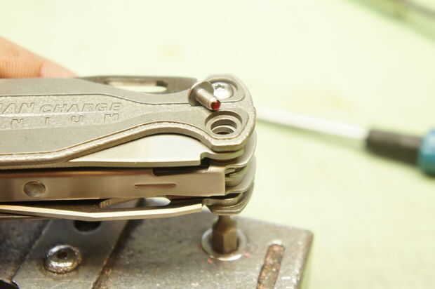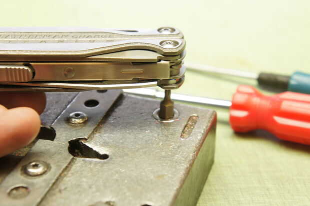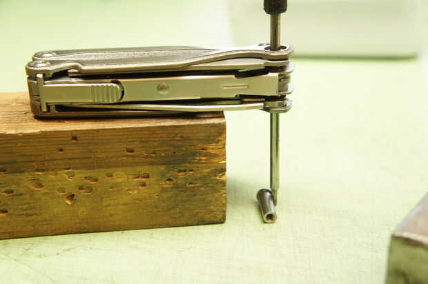 Cuando se quita el tornillo, utilice su poker para empujar el perno el resto a través de la herramienta. Puede que necesite pellizcarse las funciones exteriores para impedir atascamiento en el pasador.