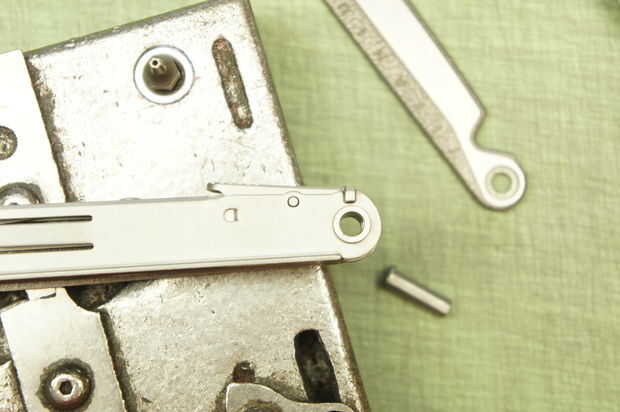 Se introduce el pin de las funciones interiores. No es cilíndrica, hay un área plana en lados opuestos del perno. Esta clave se relaciona con la forma de los casquillos de acero entre las funciones y el soporte de la manija.