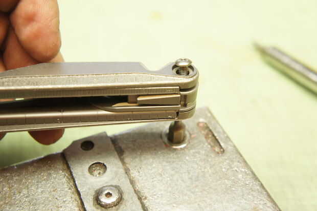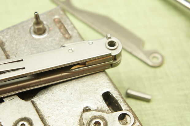Es importante orientar la herramienta como fotografiado para que no se gira el perno. Si el perno se gira mientras que las funciones se llevan a cabo todavía, es posible "completar" los casquillos de acero y desalinear la clave, lo que hace difícil extraer el pasador.