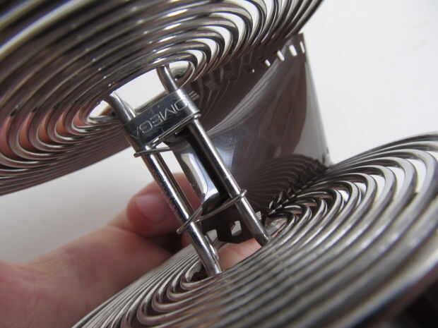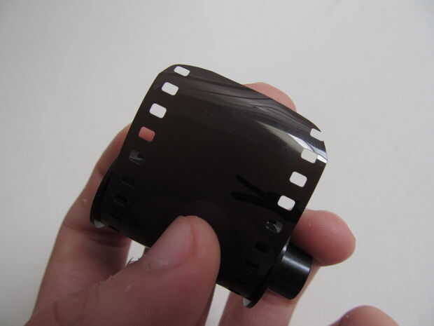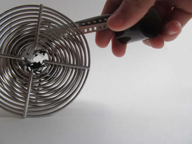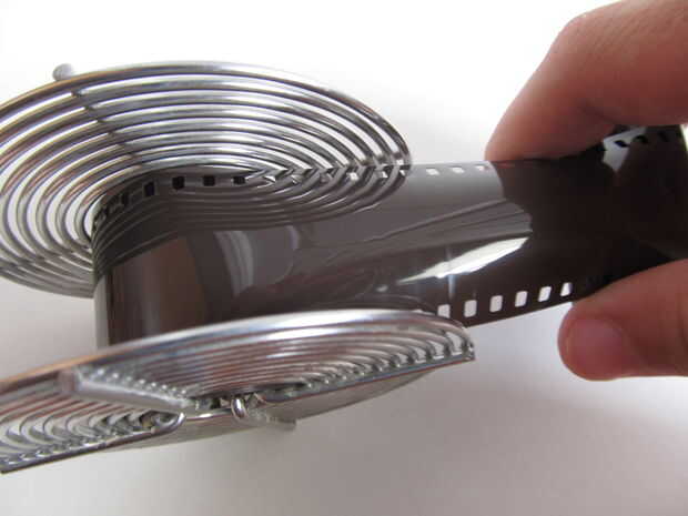 Ahora en el cuarto oscuro: tiene el abrelatas de botella del preparado junto con su rollo de película. Pop de la parte inferior. sacar la película en el carrete, Asegúrese de que no se toquen la superficie de la película. Ahora corte el extremo de la película para el cargamento más fácil en el carretel. Ponga el extremo de la película en el carrete y comience a enroscarlo en. Aquí está un video útil http://www.youtube.com/watch?v=CY7OeJmwnJ0&feature=related .
