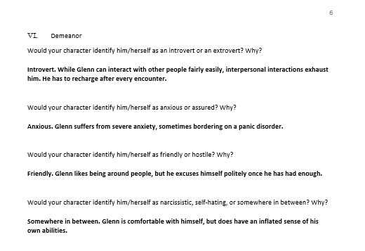 Por ejemplo, si estoy acertado en establecer comportamiento de Glenn como se adapta a un individuo introvertido pero socialmente interesado que tiene que excusarse de reuniones sociales para tener ansiedad, un lector podría potencialmente la visión a Glenn haciendo lo mismo en un evento social real en la realidad.