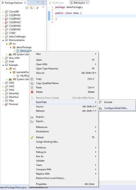2. Haga clic derecho un archivo de clase en el nuevo proyecto y seleccione Build Path -> Configure Build Path... (Figura 1)