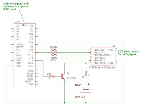Yo uso un Uno y un protoboard con un transistor 2N3904, 2 ea 1K resistencias de las conexiones con el transistor y 4 resistencias de 100 ohm de ea para las conexiones de programación entre el Uno y el Digispark. Usted puede ser capaz de utilizar resistencias de 1K para las conexiones de programación en un desnudo ATtiny85, pero encontré las necesidades Digispark montadas un valor más bajo. Probablemente es porque lo necesito para vencer las resistencias de pull-up a bordo durante la programación.