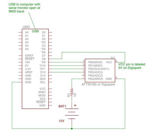 En vez de cambiar los 12V que va al pin de reset, sólo tiene que conectarlo a mano. Conectar los 12V en primer lugar, antes de poder VCC (que envíes alimentación VCC ejecutando el bosquejo, que se enciende el Digispark o ATtiny85 de pin del Arduino 8). Puede tomar un par de intentos, porque a veces no pasa nada después de ver el mensaje "Modo de programación de introducción" en el monitor serie. Por lo tanto, si usted necesita comenzar de nuevo, sólo Desconecte el cable USB de la Arduino y retire la batería de 12V y cerrar al monitor serie. Luego conectar la batería, seguida por conectar el cable USB y serial monitor abierto cuando se le solicite, introduzca un carácter. La programación ocurre rápidamente, tal como se muestra en el video del paso 3. Proceda al paso 4 para programación de ISP.