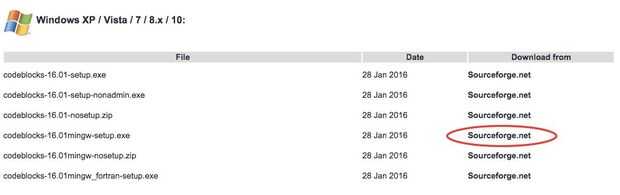 Una vez haya hecho clic en el "Windows XP / Vista / 7 / 8.x / 10" enlace, verá una tabla con tres títulos (archivo, la fecha y descarga). Es importante que descargues la versión titulada "codeblocks-16.01mingw-setup.exe", Code::Blocks no se ejecutará correctamente en las otras versiones. Haga clic en el enlace debajo de "Descargar desde" que corresponde a esta versión. Esto redirigirá a una página web que automáticamente comenzará a descargarse el archivo de instalación de Code::Blocks en su computadora.