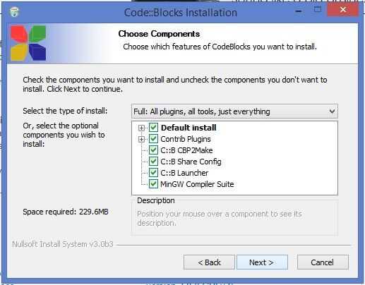 El siguiente paso le pedirá que elija los componentes de Code::Blocks desea instalar la configuración predeterminada de fineza, no es necesario cambiar nada aquí, haga clic en el botón "Siguiente" en la parte inferior de la pantalla para continuar.