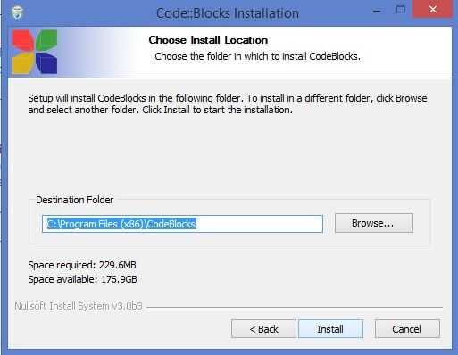 El siguiente paso le preguntará donde desea Code::Blocks para instalar en su computadora, la configuración por defecto está bien, no es necesario cambiar nada aquí, haga clic en el botón "Instalar" en la parte inferior de la pantalla para continuar.