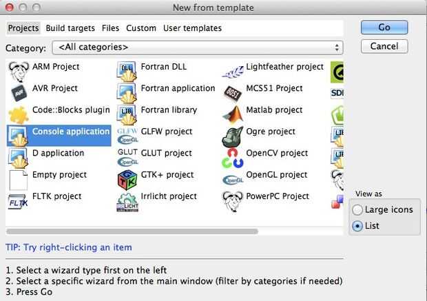 Ahora debe aparecer una nueva ventana, que te da muchas opciones de qué tipo de aplicación o proyecto gustaría empezar a crear, seleccione la opción "aplicación de consola" y haga clic en el botón "Go" en la parte superior derecha de esta ventana.