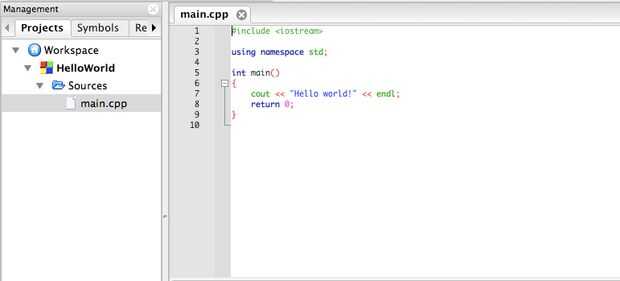 Esto abrirá el código en el área de texto grande a la derecha del archivo "main.cpp" sólo hizo clic. Estás listo para comenzar la codificación.