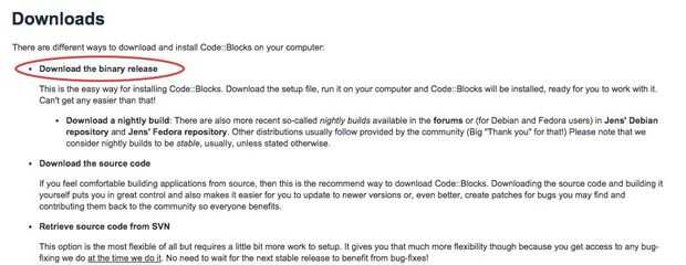 Ahora te da 3 opciones para descargar Code::Blocks, seleccione la opción "descargar la versión binaria".