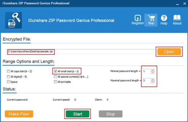 2. a fin de mejorar la velocidad de recuperación de contraseña de zip, ahora comprobamos probable caracteres en la contraseña del archivo WinZip, acorte la longitud de la contraseña en Opciones de rango y de la longitud.